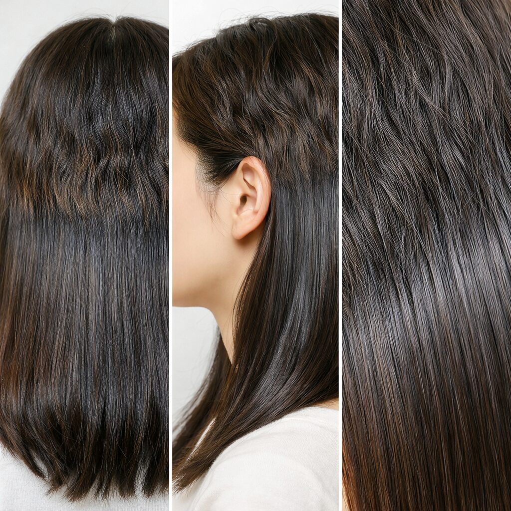 キューティクルの凹凸がなだらかになり、光の反射が均一になることで、パサついて見えていた部分が自然なツヤへと変化。